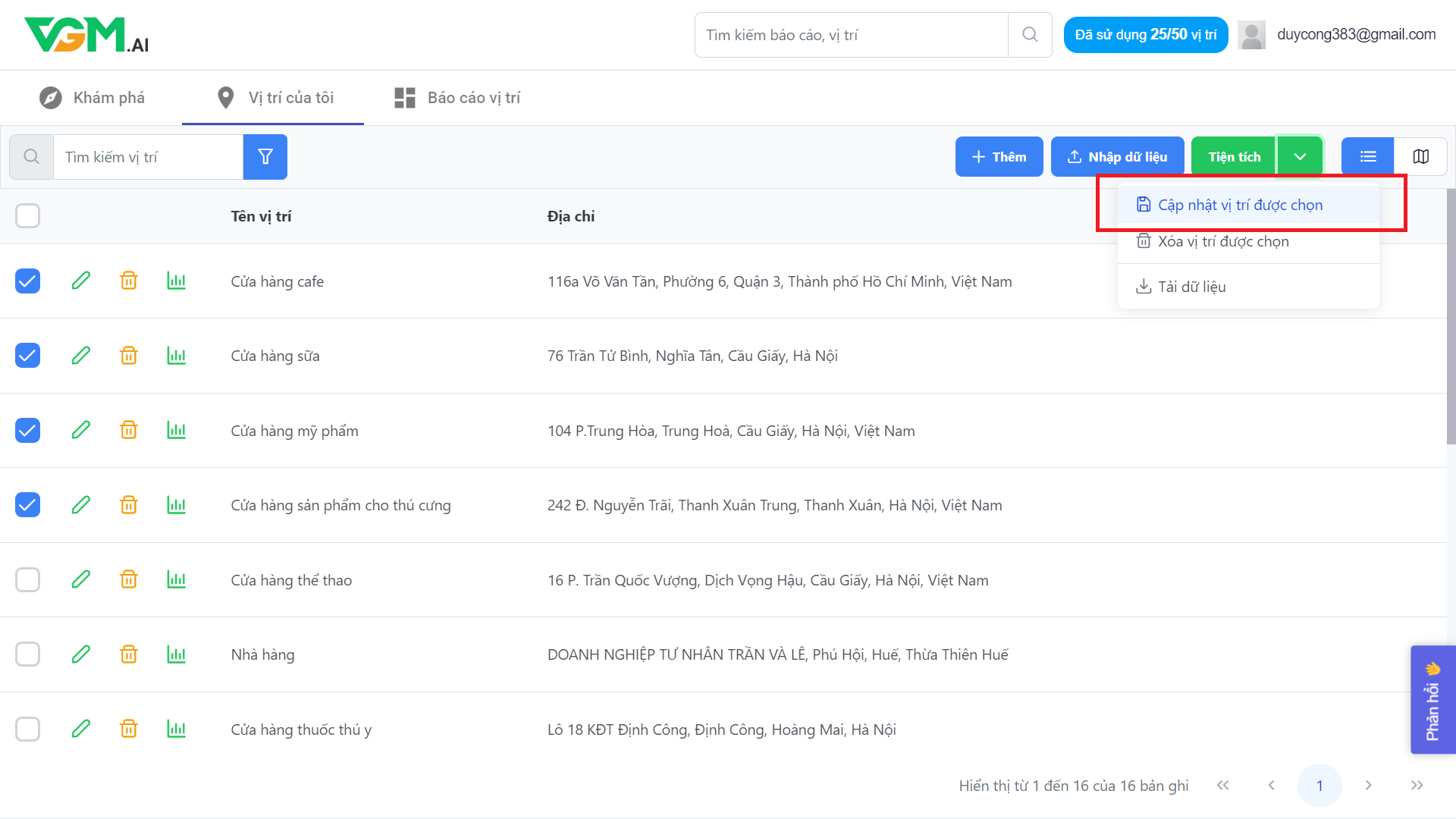 * Từ giao diện danh sách vị trí, lựa chọn những vị trí cần cập nhật thông tin: