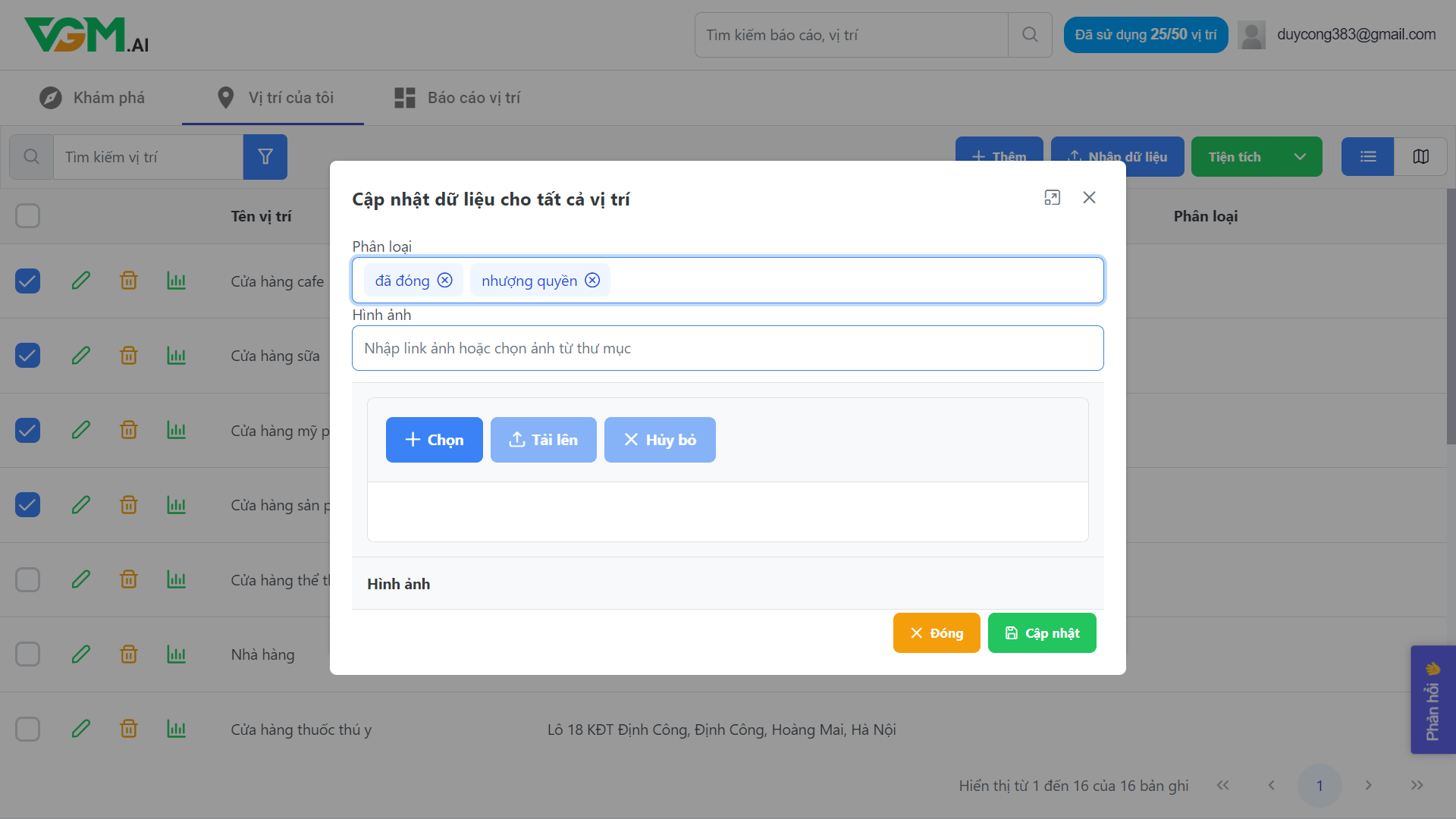 :tada::tada::tada: <mark style="color:red;">**Lưu ý quan trọng: Khi vị trí của bạn đã thực hiện phân tích bạn không thể cập nhật lại tọa độ vị trí**</mark>